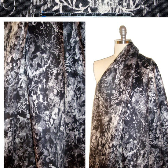 A stunning beauty from Italy, this is a printed silk gazar with a scroll abstract (35" repeat) in black and silvery white. The fabric is a medh-like basketweave with a firm and architectural drape. It is just a little bit sheer, and is best for a "runway-ready" special occasion dress, skirt or jacket, etc. Dry cleaning recommended. Sells for $95.00/yd in NY.