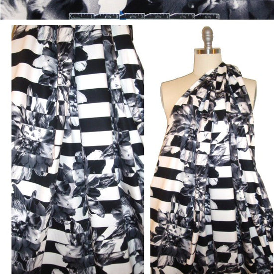 This is a beautiful cotton/lycra woven with about 15% widthwise stretch, a cottony dress weight with a very dry hand and smooth surface texture. The fashion forward optic floral stripe print (25" repeat) features black, gray and white. It is medium-weight, opaque, with a cottony drape. Perfect for a sheath dress, skirt, jacket, shorts, etc. Hand or machine wash separately, cold, hang to dry. 1.75 yds.