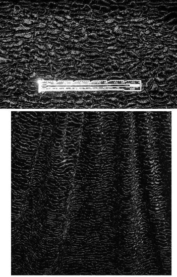 This is a wonderfully silky soft faux Persian lamb in a basic black---much richer color than it appears in the photo. Luxurious, with a soft sheen and wonderful texture, liven up your holiday season with a coat, jacket, cape, wrap, throw (line with satin or silk for a beautiful holiday gift), or use as trim on a solid color or tweed coat or jacket. It is backed with a soft and malleable fused woven. Dry cleaning recommended. Gorgeous quality at a great price! See Shannon's sewing guide for great tips on sewing with this fabric (upper right of this page). .66 yds.