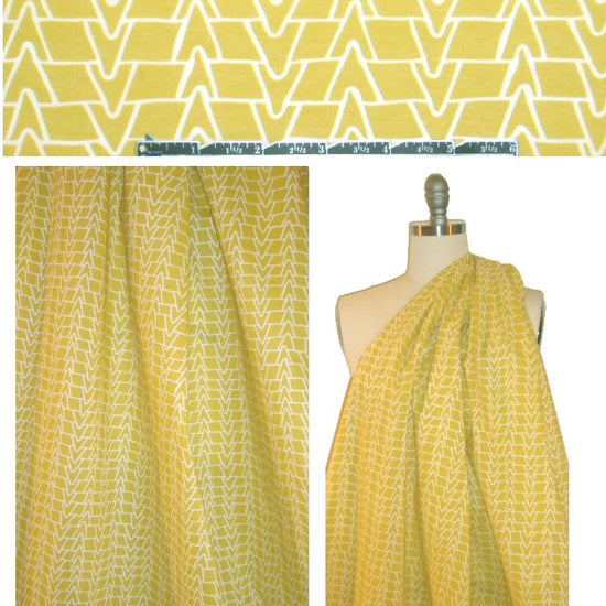 This is a lovely quality cotton woven from a CA designer, "starchy"-textured, lightweight and semi-opaque with a crisper drape . The very cool graphic print features tones of acacia (a yellow-green tone) and white (PANTONE 13-0640). Make a fabulous shirt or blouse, top, tunic, dress, skirt, etc. Some styles will need lining or layering. Test first if you wish to hand or machine wash, and hang to dry.