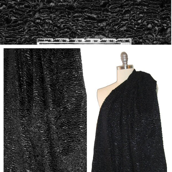 This is a wonderfully silky soft faux Persian lamb in a basic black, richly saturated in color and very luxurious! It has a soft sheen and wonderful texture -- medium weight with a soft drape. Perfect for a coat, jacket, cape, wrap, throw (line with satin or silk for a beautiful holiday gift), or use as trim on a coat or jacket. It is backed with a smooth malleable woven. Dry cleaning recommended. Gorgeous quality at a great price!