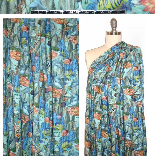 Here's another AMAZING cotton/lycra print imported from The Netherlands, to knock your EmmaOneSocks off! First, the quality of the fabric is sublime, soft and substantial, with about 40% stretch in both directions. It is opaque and has a luscious hand and drape with body. The digital "age of aquarium" ( ha ha) print (12.5" repeat) features an aquarium scene with a mix of the realistic and cartoonish. The colors include blues, greens, coral and orange tones, aqua, etc. (PANTONE 13-0442, 13-5309, 16-1529, etc.). Make a fabulous tee, top, tunic, kidswear, skirt, dress, loungewear, etc. The manufacturer recommends hand or machine wash warm, hang to dry. Please test first. 1 yard.
