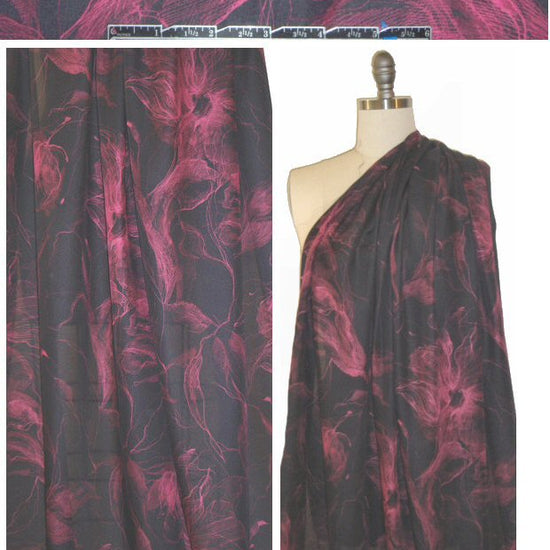 From Mi11y, this wonderful Italian silk blouseweight is a semi-sheer and floaty woven with a slight crepey texture and an exquisite "whispy flowers" print in tones of deep midnight and pink rose (PANTONE 19-1102, 17-2520). Perfect for a lovely blouse, top, tunic, dress, etc. Some styles will need lining or layering. Dry clean or test first if you wish to hand wash and hang to dry.