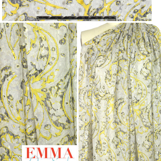 A gorgeous Italian silk jacquard crinkle sheer, very lightweight with gold metallic dots and overprinted with a lyrical, fantastical abstract. It's all silk except for gold metallic accents, and the colors are black, mustard yellow and very pale gray (PANTONE 13-0752, 14-4002, etc.). It is delicate and drapey with just a touch of sparkle. Make a scarf, blouse, top, overblouse, tunic, etc. Some styles will need lining or layering. Dry clean only.