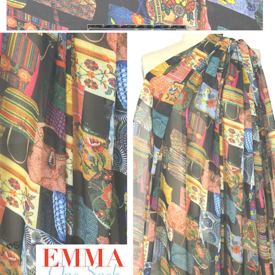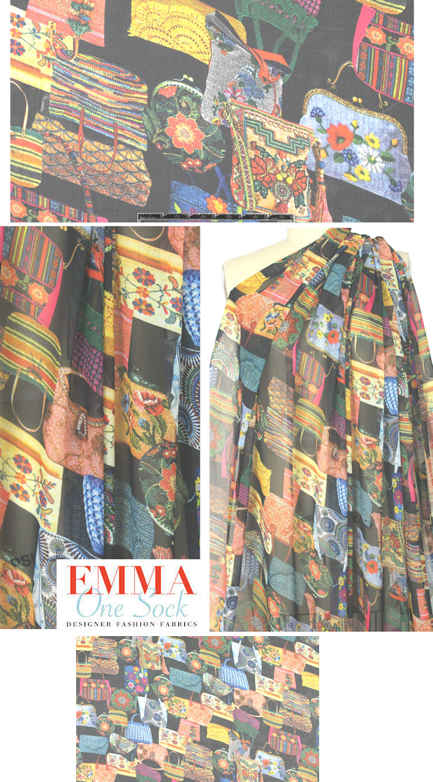 This amazing sheer "poly-silk" chiffon woven (looks and feels like silk chiffon but is not) has a floaty, soft drape and you will recognize the tapestry purses print from our printed velvet (Fabric #63690). It has a 24" repeat in a beautiful blend of tomato red, blue, pale blue, pink, green, etc. on a black background (PANTONE 18-1550, 19-4056, 12-0738, 18-2043, etc.). It is perfect for a scarf, or overlay for a blouse, top, tunic or dress. Hand wash and hang to dry. LAST PIECE, 1.5 yds.