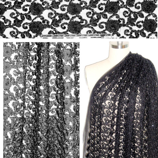 This beaded and embroidered mesh lace is absolutely STUNNING! The base fabric is a honeycomb mesh, embroidered with rayon floss, and embellished with little beads, all in black (photographed on a white background to show the design). The flowery design is stunning, and while overall it is very textured medium weight fabric, it is mostly sheer. With its supple drape that has some body, and is perfect for a special occasion dress, skirt, jacket, etc. Dry clean only. 1.25 yds.