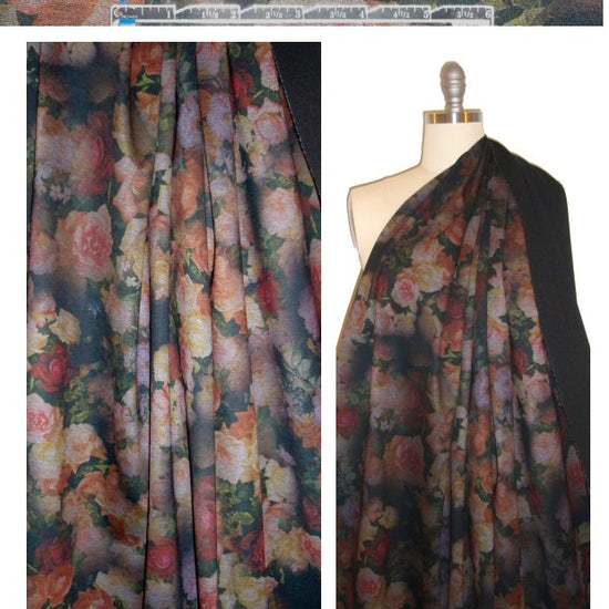 What a wonderful printed ponte! The base fabric is a beautiful quality black ponte, and the floral, in tones of sepia, garnet, deep forest, lilac gray, etc. (PANTONE 15-1225, 18-1612, 15-2705, etc.) comes up dark and subdued because of the black base color on which it is printed. This perfect medium weight ponte has about 35% stretch in the width, 15% in the length, with great recovery. There's no bleed through to the reverse side, so it makes an excellent solid contrast color! This fabric has lovely drape with substance and body, perfect for fashion-forward skinny pants, body hugging knit dress, tunic, skirt, knit suit, etc. Manufacturer recommends machine wash, tumble dry low, or dry clean. No bleach. 2 yds.