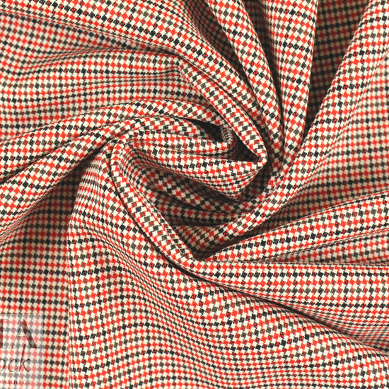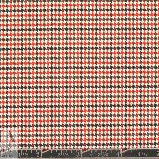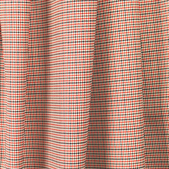 This exquisite Italian suiting is a classic and sophisticated virgin wool stretch woven, a refined micro-plaid jacquard with a soft and smooth hand. It has about 20% widthwise stretch, and the colors are red, black gray and creamy ivory (PANTONE 18-1655, 18-0000). It is a dress/pants/suiting weight with a tight weave, and is opaque with a beautiful drape that has a bit of body. The weight and color are so versatile; this beauty will work for tailored pants, dress, skirt, suit, jacket, etc., and for men or women. Dry cleaning is recommended.