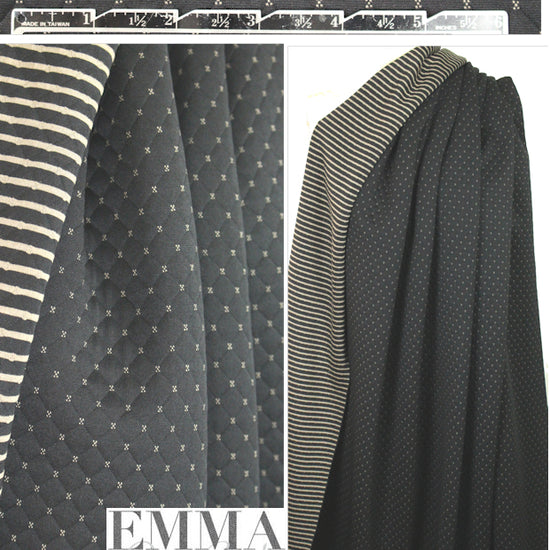 This fabulous yarn-dyed 3-ply matelasse' knit has a quilted diamond pattern with the contrast color at each junction. It is textured, supple and soft, and the colors are black and khaki (PANTONE 15-1216). The layers are attached where you see the lines of the diamonds. It is medium weight and opaque with a soft drape and about 30% widthwise stretch. A versatile fabric that is perfect for an upscale hoodie, a cardigan, pullover, tunic, sweater dress or skirt, jacket, etc. The back is striped and makes a great contrast fabric. Hand or machine wash, hang to dry (please test first).