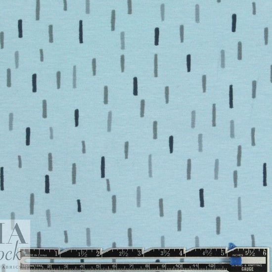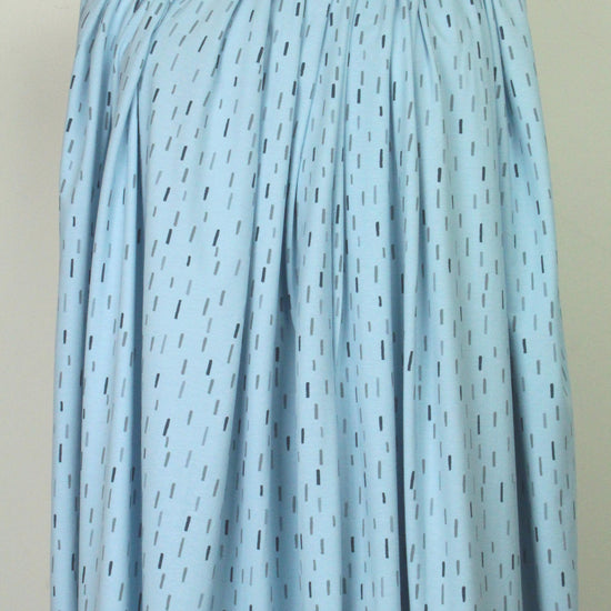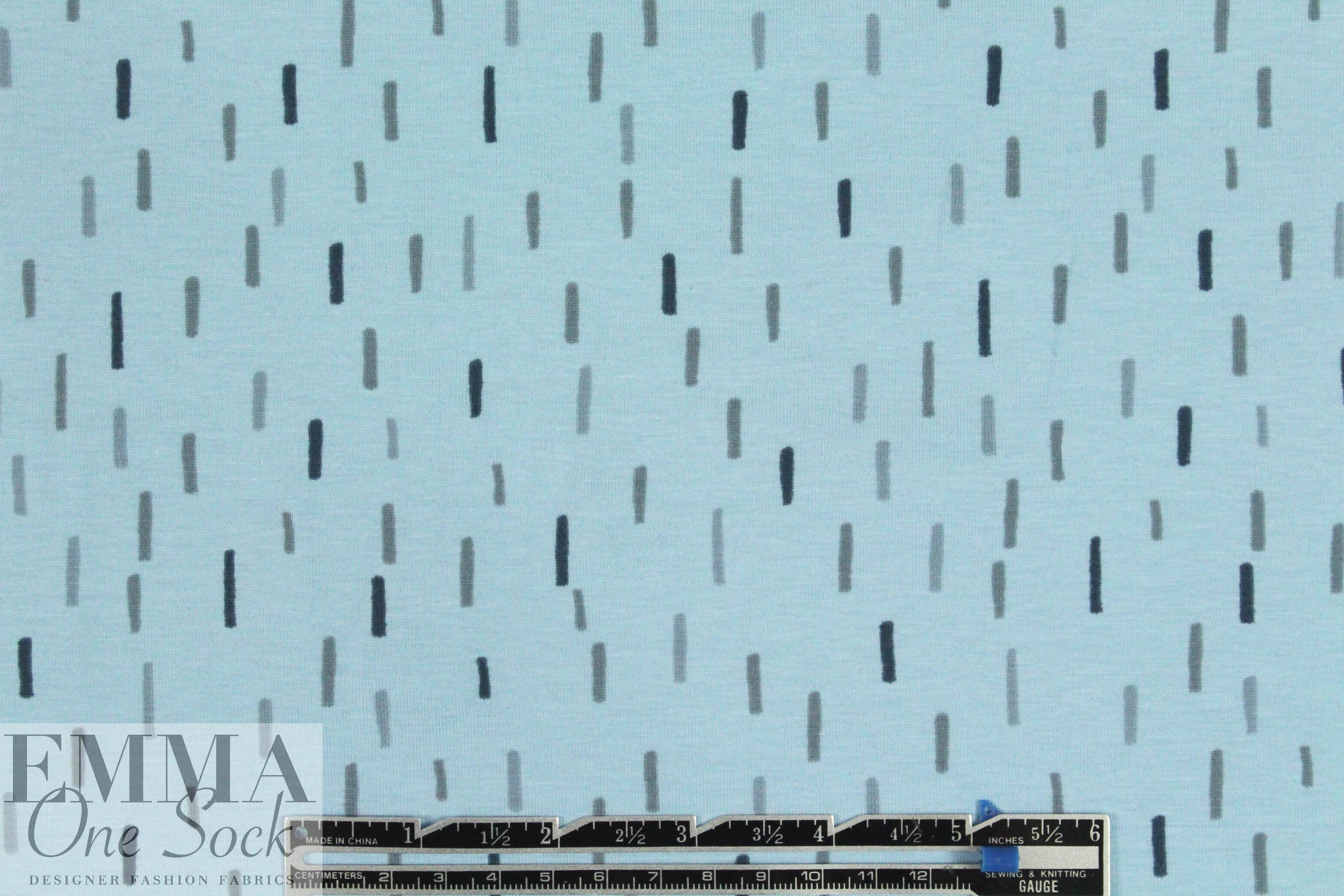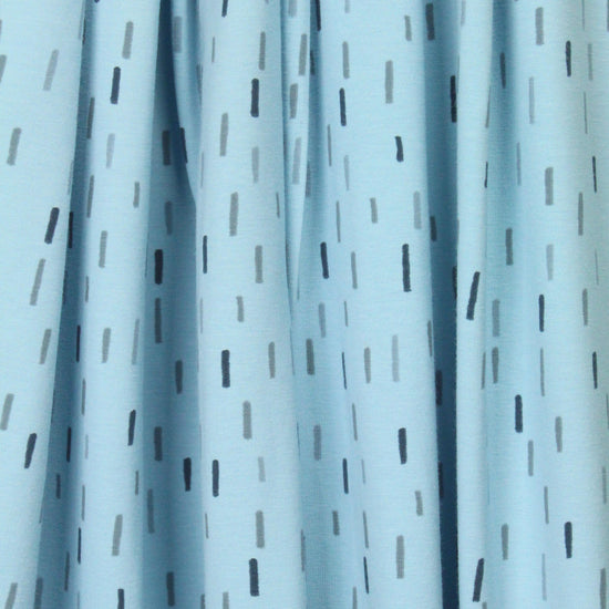 Here's another fabulous cotton/lycra print imported from The Netherlands! First, the quality of the fabric is sublime, soft and substantial, with 50% stretch in both directions. It is an eco-friendly bio-cotton knit, opaque with a luscious hand and drape with body. The "dashy dash" graphic in powder blue, light gray and dark gray (PANTONE 15-4005 is close, 16-4408, 18-4011) is perfect for a fabulous tee, top, tunic, skirt, dress, childrenswear, etc. The manufacturer recommends hand or machine wash warm, hang to dry. Please test first.