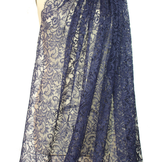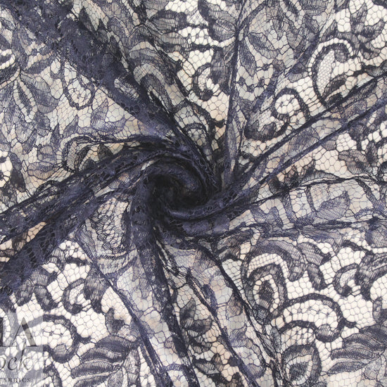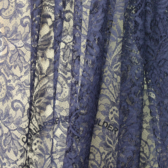 If you are familiar with Solstiss laces, you will appreciate this exquisite piece from Monique Lhui11er! It is a high-end French double scallop lace, with a very delicate and feminine floral design in navy (PANTONE 2119-XGC... a bit towards purple). Lightweight, drapey, heavenly! Use for any project calling for lightweight lace. Dry cleaning recommended.