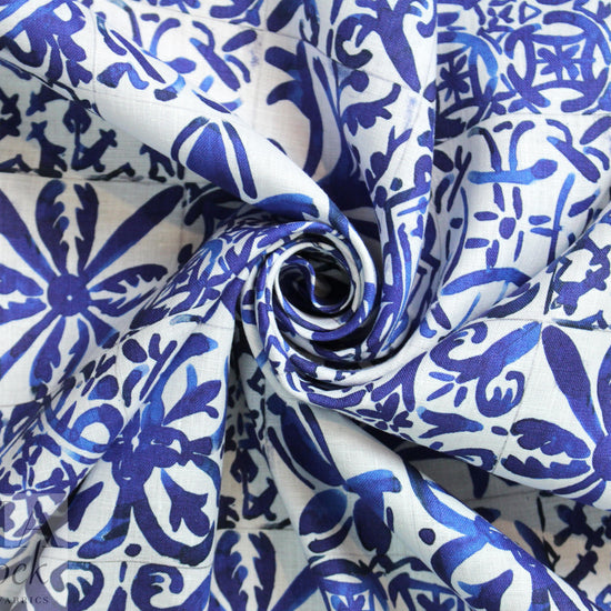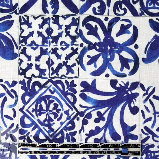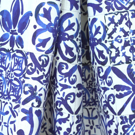This is an exquisite digitally printed "Moroccan tile" design on a medium-light weight linen that has lovely drape with body. This gorgeous print features royal blue designs on a soft white ground (PANTONE 18-3963). Absolutely stunning as are all of the digital linen prints! The weight is very versatile, and you can easily cut in either direction or on the bias, to suit your taste and vision. Suitable for a skirt, dress, shirt, tunic, etc. Dry cleaning recommended by the manufacturer, but we've put many of these linen prints in the washer and dryer and they came out just fine.