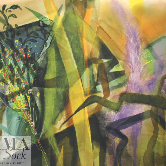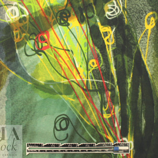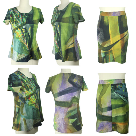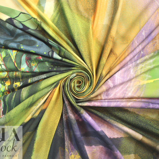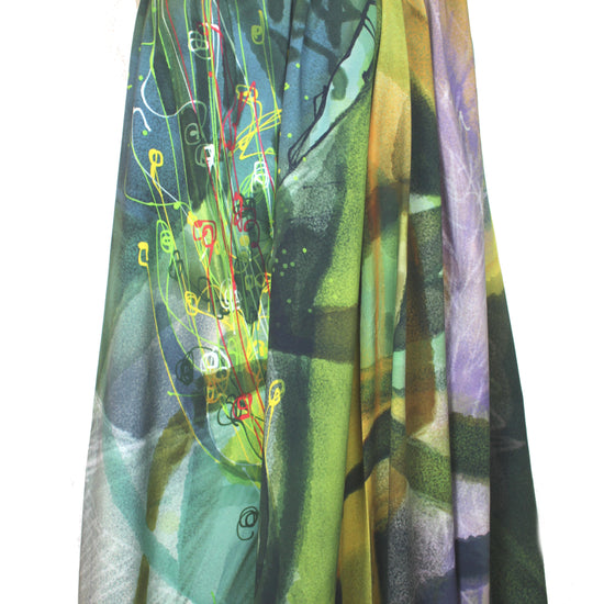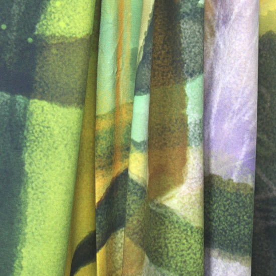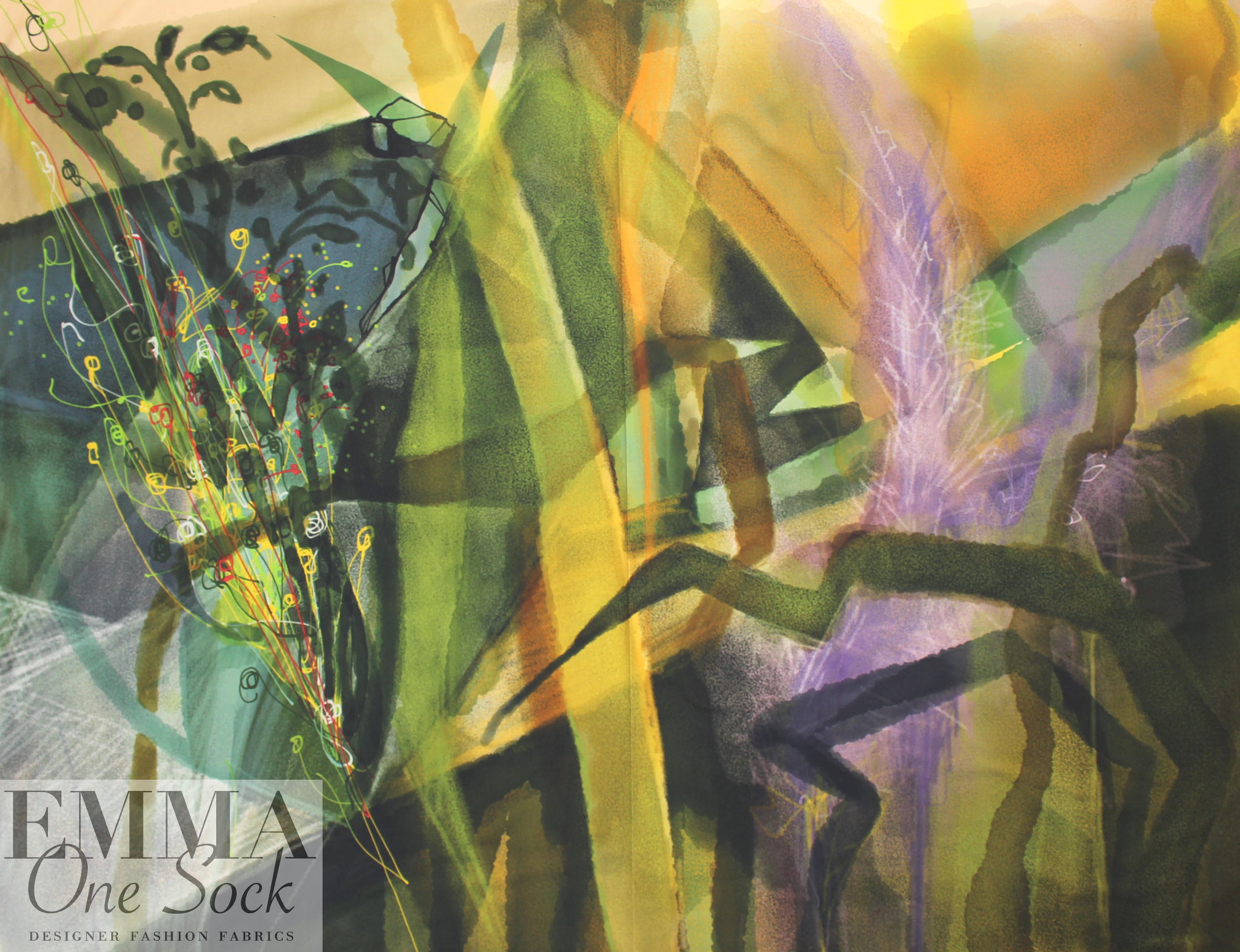 This is an EOS limited edition, the second in a continuing series of original artwork fabrics! This stunning piece of art was done by my neice, Joanna Dion Brown. The fabric is our gorgeous cotton/lycra imported from The Netherlands, and the quality of the fabric is sublime, soft and substantial, with about 60% stretch in both directions. It is opaque and has a soft hand and drape with body. The digital panel print is equally sublime, Joanna's artwork with many areas of varied interest just waiting to be made into an unique garment! The colors in this one are so current, and perfect for fall: spectacular shades of green, spice, lavender, teal, etc. (PANTONE 16-0540, 18-0426, 17-3725, 15-1150, etc.). The first photo shows the entire panel. Make a very special tee, top, tunic, skirt, dress, etc. It's possible to make several garments that will all look totally different! Don't feel that you necessarily need to use all of the panel in one garment. See examples below. The manufacturer recommends hand or machine wash warm, hang to dry. Please test first. 1.25 yds. or 1 panel.