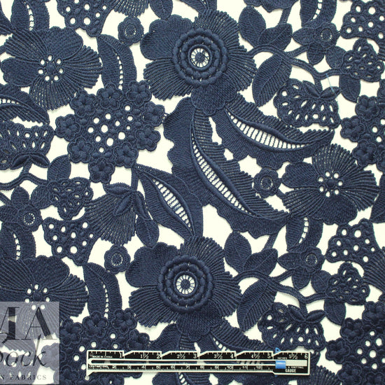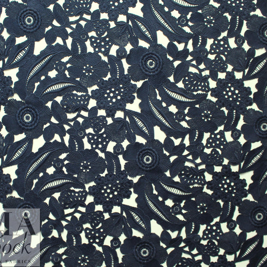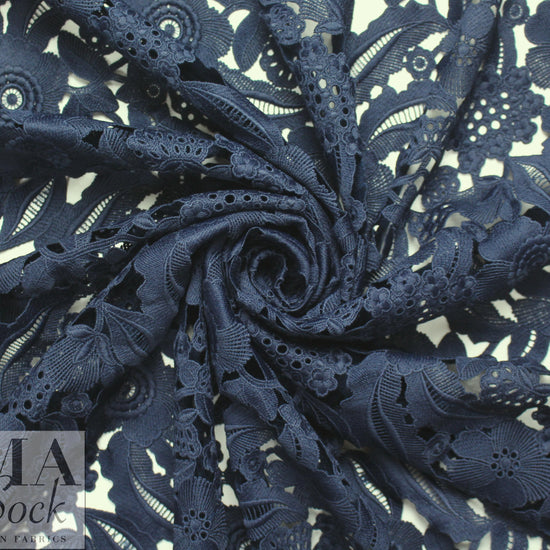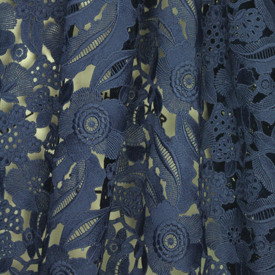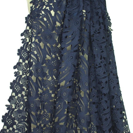 From a NY designer, this beautiful guipure lace is so elegant and classic, and the color is gorgeous blue indigo (PANTONE 19-3928). The floral motif goes all the way out to the edges to create lovely shaped selvages. It has lots of texture and dimension. Its soft drape with a bit of body make it is perfect for any project calling for guipure lace: tops, tunics, dresses, skirts, jackets, etc. Some styles will need lining or layering. Dry cleaning recommended.