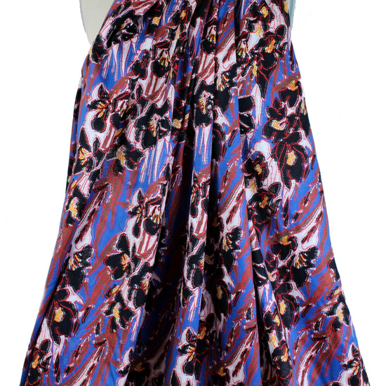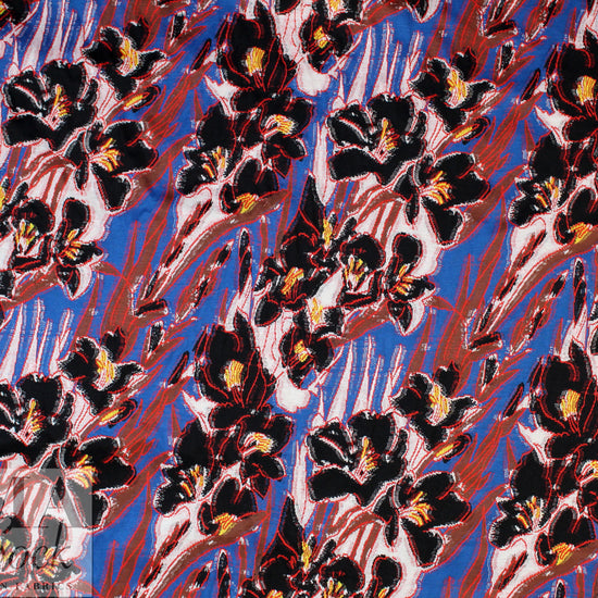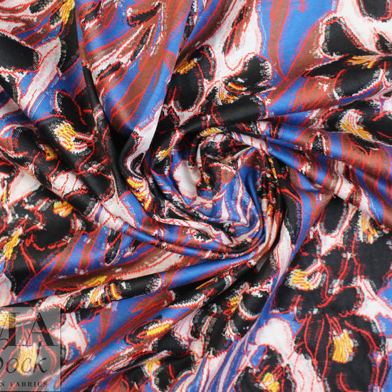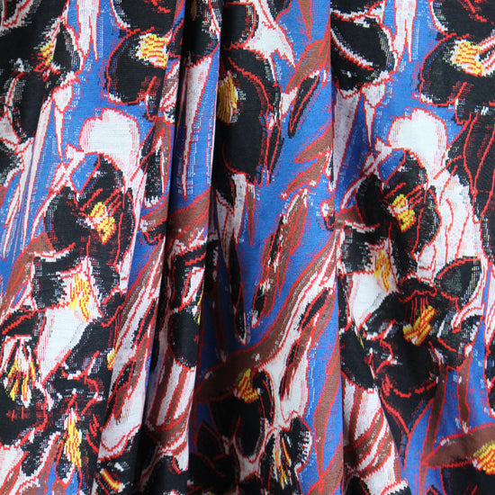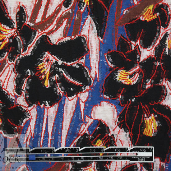 From a very, very famous designer, this gorgeous jacquard knit (not a doubleknit) has 10-15% widthwise stretch yet it's very stable, and is medium-light weight and opaque with some body in the drape. The stunning floral design (10" vertical, 10.5" horizontal repeat) is yarn-dyed -- not printed, and the reverse is not meant to be seen. The colors include cobalt, red, black, white, nutmeg and lemon (PANTONE 18-4140, 18-1763, 13-0840, 18-1229). It would be perfect for a lined cardigan or sweater jacket, top, tunic, sweater dress, skirt, etc. This is more like a cottony sweater knit than a jersey knit. Lining with a plain knit, self-lining, or lining with Shaper power net or a stretch woven would all work. Dry clean or test first if you would like to hand wash cold, and lay flat to dry.