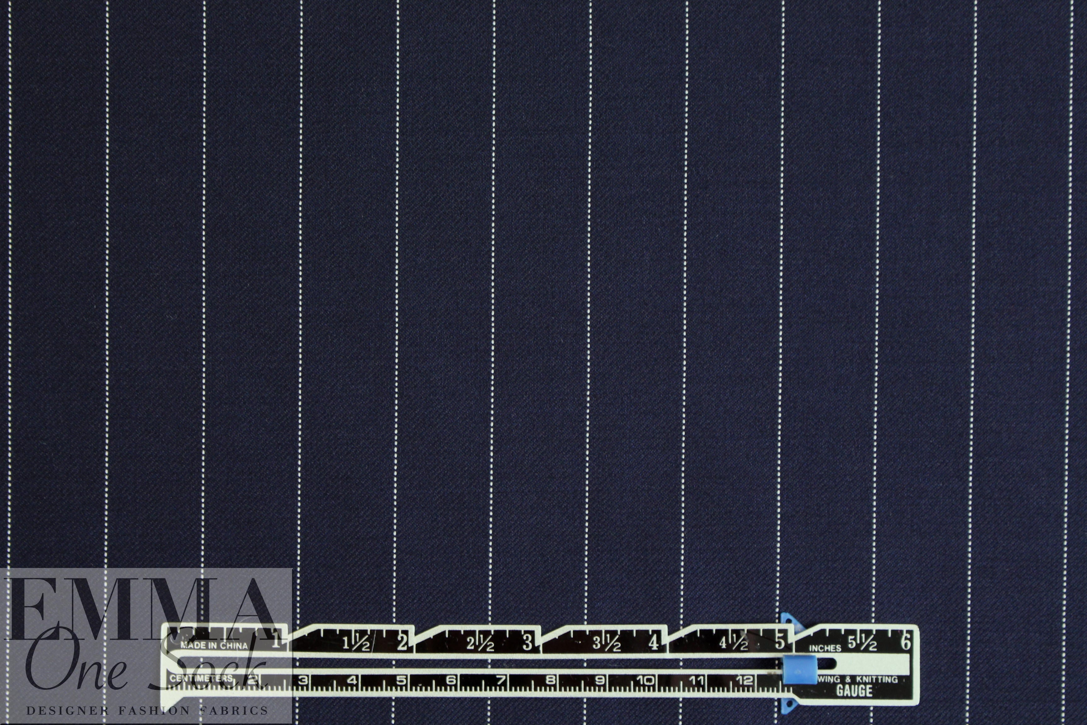 This Italian wool pinstripe suiting is an opaque lighter suiting weight with a very refined weave and hand. It has beautiful drape with just a bit of body. Its vertical, yarn-dyed stripes are 3/4" apart, and the reverse is the same. The colors are midnight blue with off white stripes (PANTONE 19-4010) and is perfect for a stylish tailored suit, trousers, jacket, skirt, vest, dress, etc. Dry cleaning recommended; please test first if you want to hand wash and hang or lay flat to dry. 1 yard.