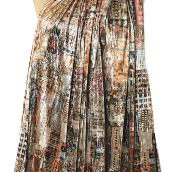 This is a gorgeous stretch velvet, lightweight with a liquid drape and luxuriously soft hand, a beautiful sheen and about 50% crosswise stretch. The 'urban montage' print takes inspiration from city life, in a 24.5" repeat. The colors include shades of mocha, brick, taupe, etc. and touches of dusty aqua (PANTONE 18-1112, 18-1540, 15-4717, etc.). Make a top, tee, tunic, dress, skirt, shirt, etc. for day or evening! Hand wash and hang to dry. 1 yard.