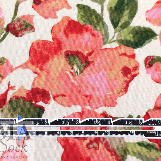 This is a viscose challis woven, drapey and nearly opaque with a matte finish and a smooth surface texture. The "coral blossoms" print (29.5" repeat) features coral, red, pink and soft green tones on a creamy white background (PANTONE 16-1542, 14-2311, 19-1757, 18-0426, etc.). Make a blouse, top, tunic, dress, maxi-dress, skirt, etc. Some styles may need lining. It is Oeko-Tex certified for non-toxic chemicals and dyes. Manufacturer recommends hand or machine wash, hang to dry. .5 yds.