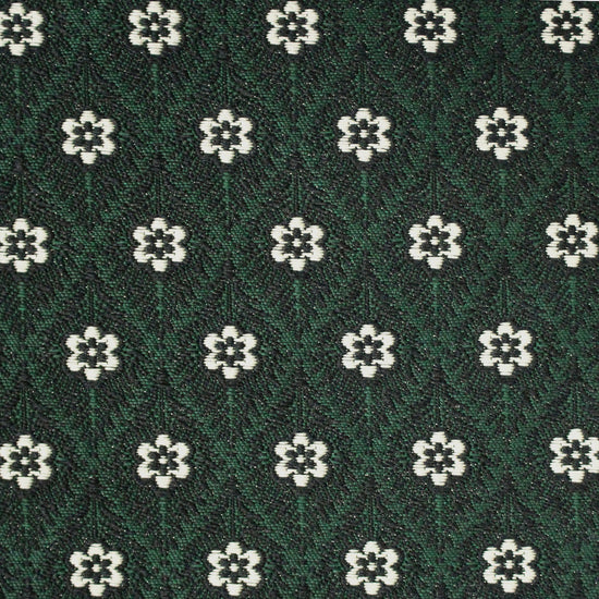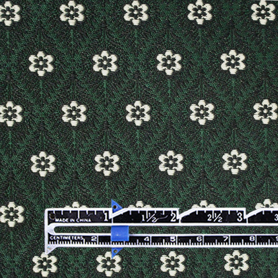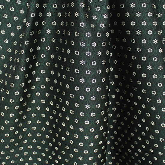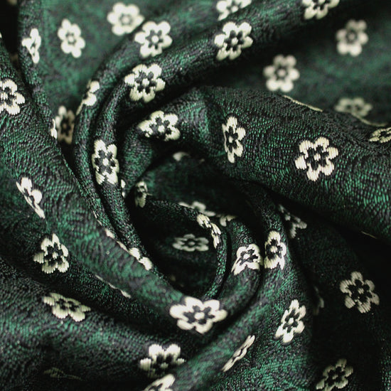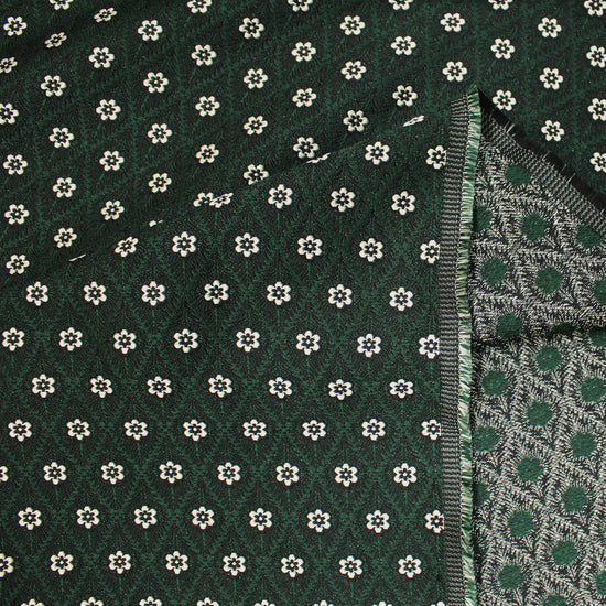 From designer deadstock and made in Italy, this is a very handsome jacquard woven in a medium suiting weight, woven in a high-quality polyester. It is opaque and stable in both directions with cottony crispness in the drape, yet very malleable and soft against the skin. The gorgeous "evergreen floral" design (1.25" repeat) is emphasized by a bit of dimension and features antique white daisies and black filigree on a rich forest green background. Make a tailored suit, jacket, sheath dress, topper coat, vest, skirt, fitted dress pants, etc. Dry cleaning is best; please test first if you wish to try another method.