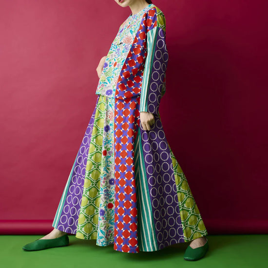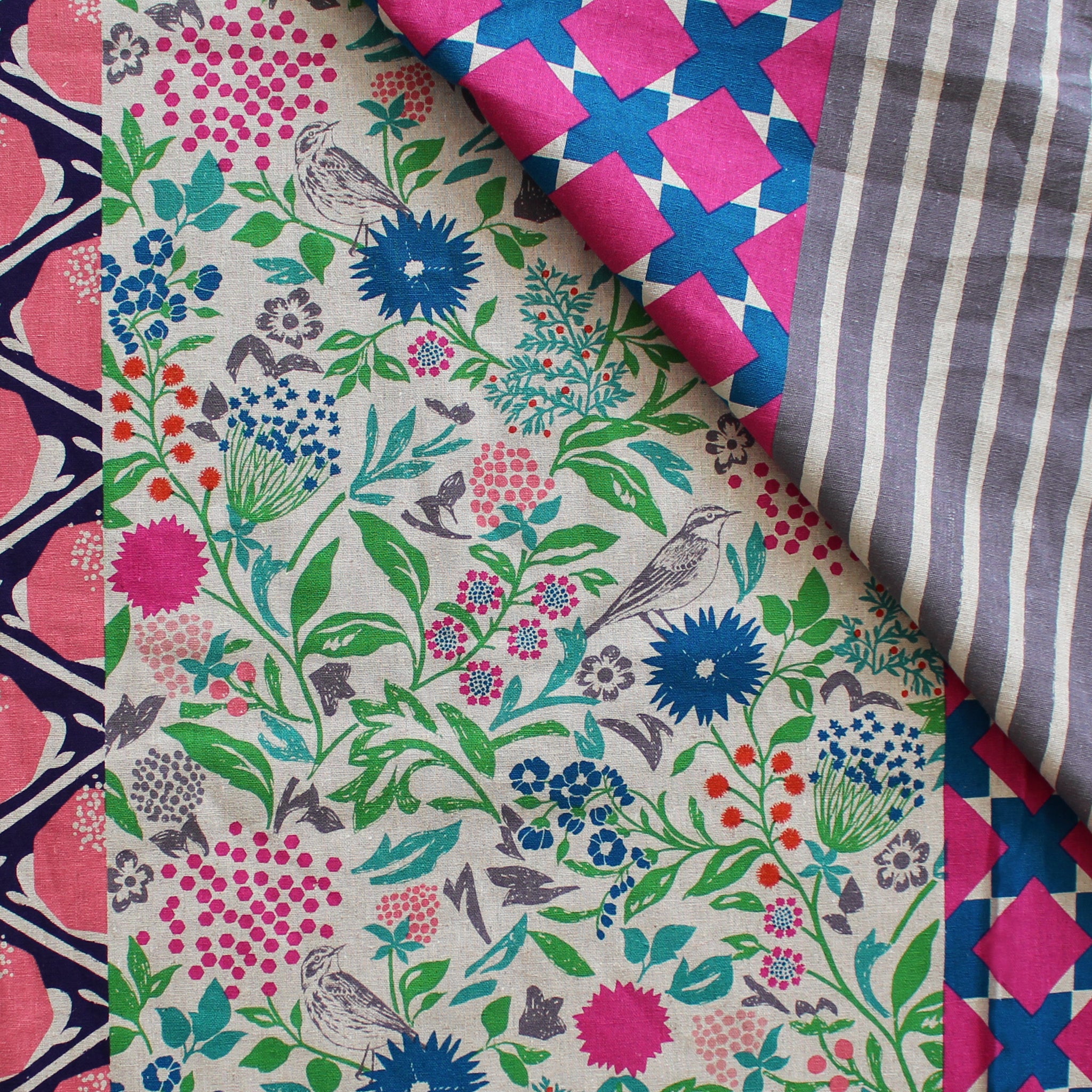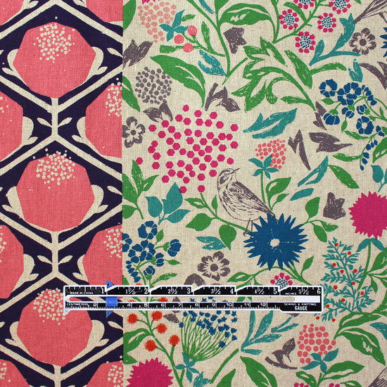 From one of KOKKA's most beloved collaboration fabric lines, Echino, this is a lovely quality canvas that is woven from a blend of cotton and linen fibers. It is fully opaque with a cottony drape and no stretch. The "Echino and Canvas" print (23.75" repeat) features vertical bands of colorful patterns on a natural unbleached canvas base. Perfect for accessories, home decor, aprons, pants, structured dresses and skirts, jackets and overshirts. Hand or machine wash, hang to dry or tumble low (please test first).