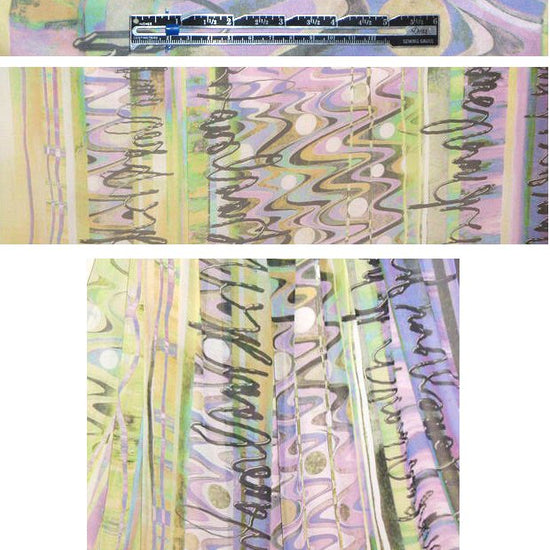 This is a fantastic digitally printed poly chiffon, sheer and light but not flimsy, with a beautiful drape. The AMAZING print is a "scribbly", "organized" abstract with areas of design in vertical sections that sort of morph from selvedge to selvedge. The primary coloring of this one is lilac and lime but as you can see, there are many other colors in the mix! (PANTONE 15-3214, 13-0645...ish, etc). Perfect as an overlay for a blouse, top, dress, skirt, caftan, etc. The manufacturer recommends machine wash cool, tumble dry low.