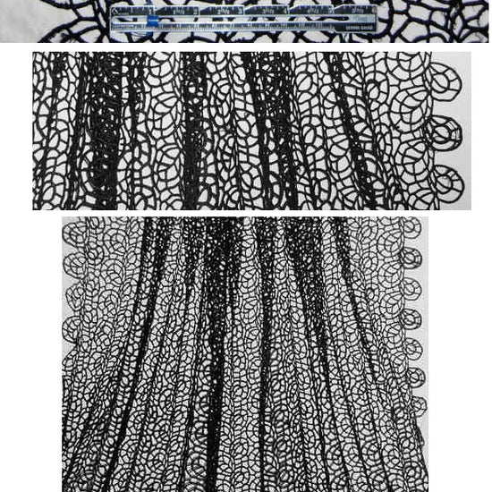 This Guipure lace is absolutely STUNNING! Guipure lace is a thicker lace, very textured, and this one is a very open design with a stained glass look, a leafy web with a lovely edging along both selvedges. The color is black (photographed on white backgrounds), and it is drapey with some body. For a special occasion. Use as an overlay for a dressy top, tunic, dress, skirt, or create a shawl or lacey jacket. Dry cleaning recommended. 1.75 yds.