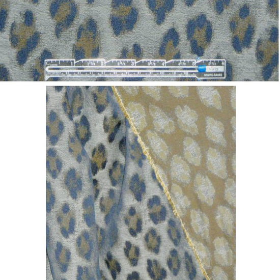 This is a beautiful quality jacquard brocade from Coach, yarn dyed with a stylized cheetah design in tones of marine blue, olive and silvery blue (PANTONE 19-4220, 18-0629, 15-4003-ish). The reverse is a lovely contrast, and this fabric is a medium weight suiting with a more firm yet very supple and malleable drape, perfect for a pretty fitted jacket, sheath dress, pouffy skirt, etc. Dry cleaning recommended.