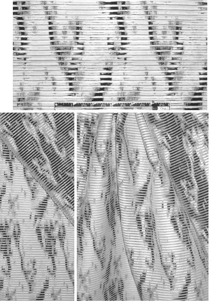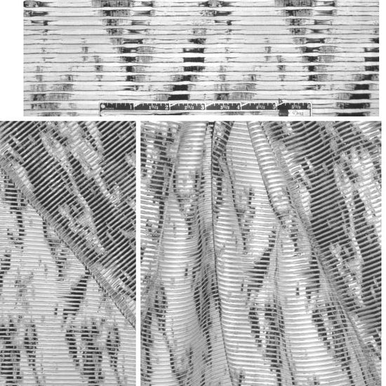 From J'Envie, this is a very cool 'slatted' weave (meaning it has more solidly woven horizontal stripes on a more sheer nylon netting), a reversible specialty fabric that will get your creative, fashion-forward juices flowing! It has a more firm drape (less firm if you lay your pattern so that the stripes run vertically) and I imagine it in a simple-lined dress coat, jacket, pouffy skirt, or a super-modern simple tunic. It needs to be lined or layered because of the sheer areas between each stripe. A black and white abstract pattern is created through the weave of the interrupted stripes, and the colors reverse on the opposite side. Dry cleaning is probably best.