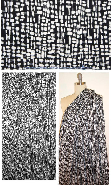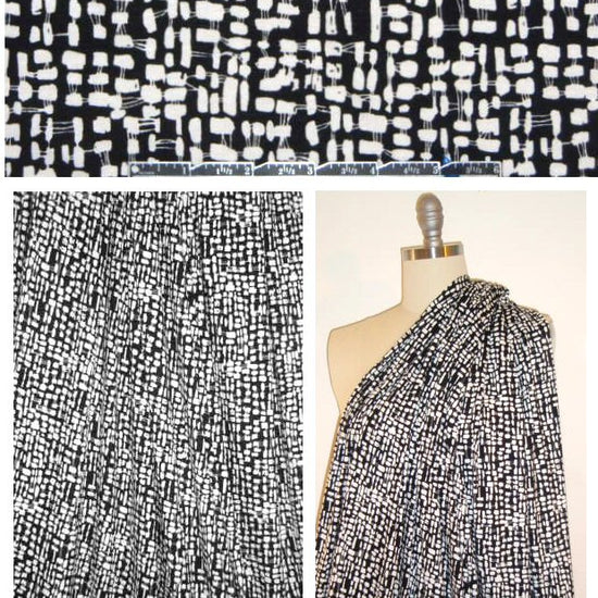 This is a lovely quality 4-way stretch rayon/lycra knit (35% stretch in the width and 25% in the length), opaque yet lightweight with wonderful drape and a "dry" (not slippery) hand. The print is a smart and stylish graphic in black and white, and it's is perfect for any number of tops, tees, tunic, dress, skirt, etc. The manufacturer recommends hand wash or machine wash gentle, hang to dry, no bleach.