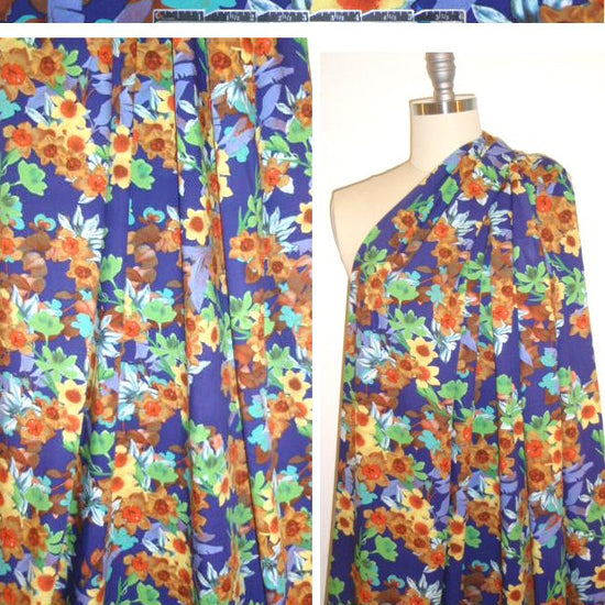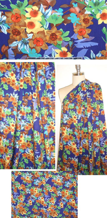This is a beautiful quality drapey viscose-rayon woven, lightweight but semi-opaque, with a flowing, soft drape. The print is a lovely stylized floral in shades of navy, bittersweet, turquoise, golden tan, wisteria, lemon, etc. (PANTONE 19-3951, 16-5123, 16-1349, etc.). Make a pretty blouse, top, tunic, dress, skirt, etc. Some styles may need lining. The manufacturer recommends hand wash, hang to dry, medium iron.