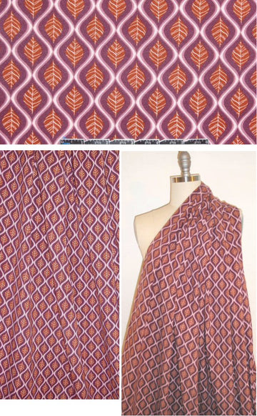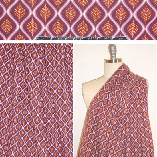 From a yogawear designer, this wonderful quality printed 4-way stretch knit is quite substantial, opaque and very stretchy with 30% stretch in both directions. The base fabric for this lovely leaf graphic print is light ballet pink, with nutmeg and two shades of plum (PANTONE 13-2004, 18-1336, 17-1710, 18-1709). Great for casual tees, tops, tunics, hoodie, dress, loungewear, leggings, yogawear, etc. Hand or machine wash in cold water, gentle cycle, tumble or lay flat to dry (please test first).
