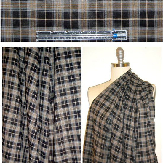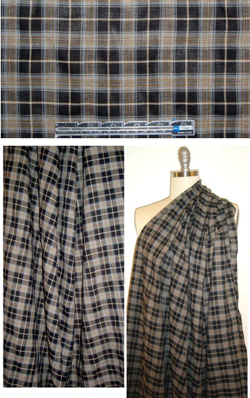 A "boho-chic" cotton woven from a CA designer, made in France, this is a lightweight, semi-sheer, yarn-dyed plaid-- similar in weight to a voile with a very refined and exquisitely soft texture. It has a cottony, floaty drape, and features shades of black, light gray and a soft bronze tone (PANTONE 16-0000, 17-0942). Menswear-inspired, very chic! Make a blouse, shirt, or tunic, scarf, etc. If you wish to hand-wash please test first.