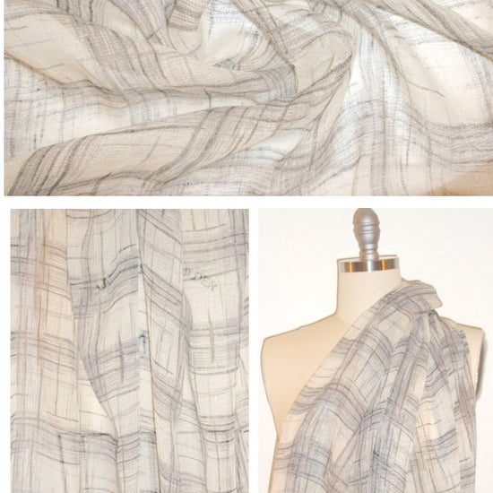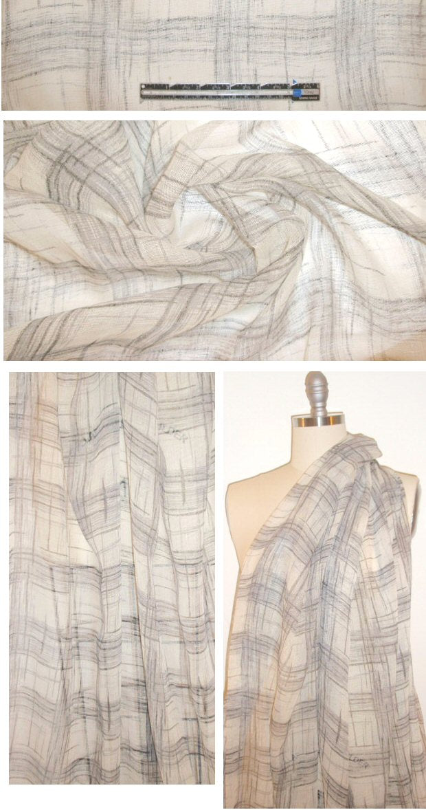 From the designer 0yako, made in Italy, this is a wonderful crinkled linen gauze, sheer and floaty, with a crosshatch design (12.5" vertical repeat) in black and natural. Casual and a bit bohemian, perfect for a fabulous for layering as an overblouse, airy top, tunic, etc. Lining or layering will be required. Dry clean or hand wash cold, hang or lay flat to dry (please test first!).