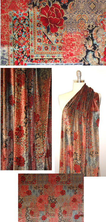 This is a stunning poly/lycra velvet knit with 2-way stretch (20% in the width only), and it's a soft and supple printed velvet with beautiful drape. Medium weight and opaque, it has a solid black back, and a wonderful floral montage print (26" repeat) in tones of red, aqua, black and warm taupe (PANTONE 19-1664, 15-4722, 17-1022). It can be dressed up or down, it's easy care, and perfect for tops, tees, tunic, dress, maxi dress, elastic waist pants, etc. Just fabulous! Please test first: Machine wash gentle, hang to dry, or dry clean.