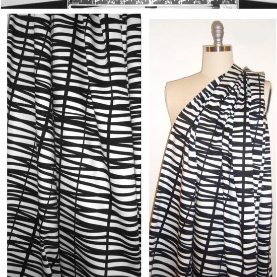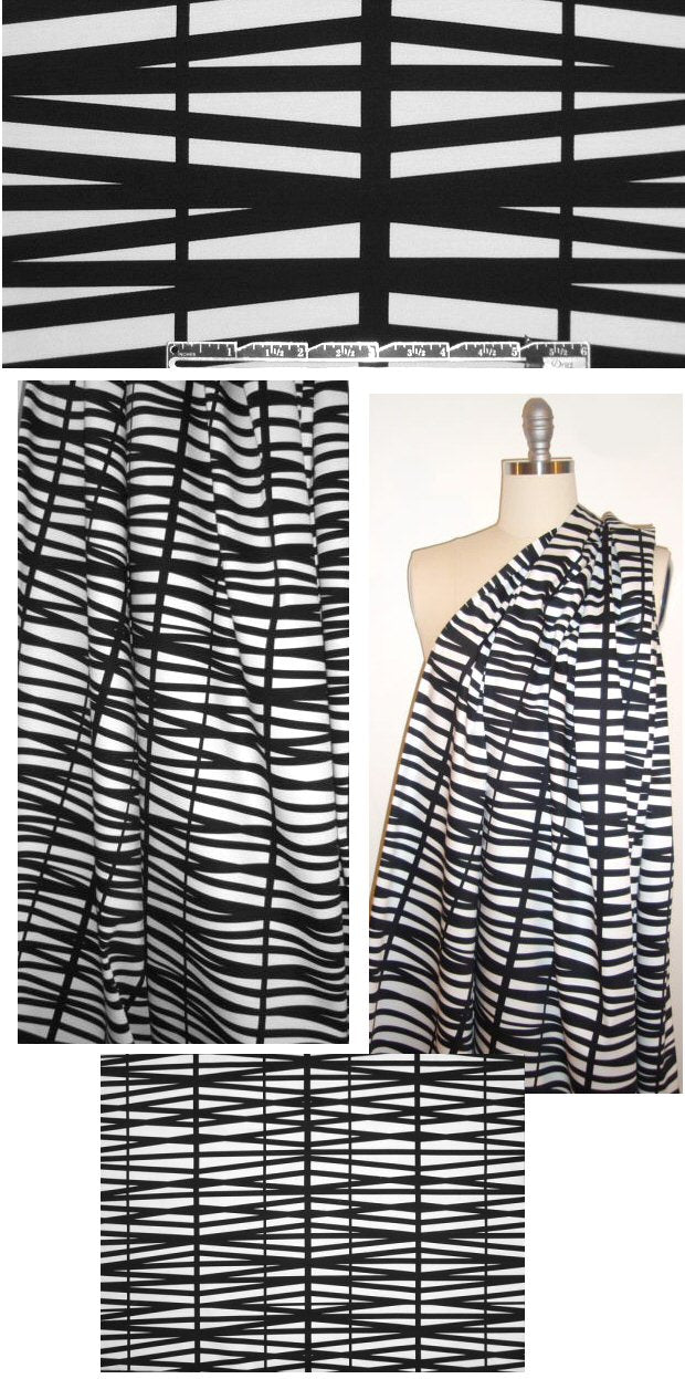 This is a wonderful cotton stretch sateen woven print, an extremely versatile dressweight with about 15% widthwise stretch, and very slight sheen. It's a very high quality cotton, opaque with a cottony drape, and featuring a bold lattice design (16" repeat) in black and white. Best for a sheath dress, light jacket, stretch pants or capris, skirt, etc. Wash separately, cold, hang to dry, medium iron (please test first!).