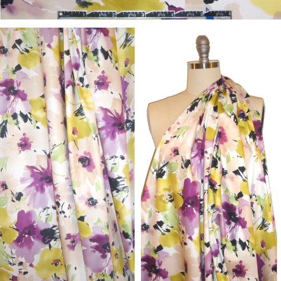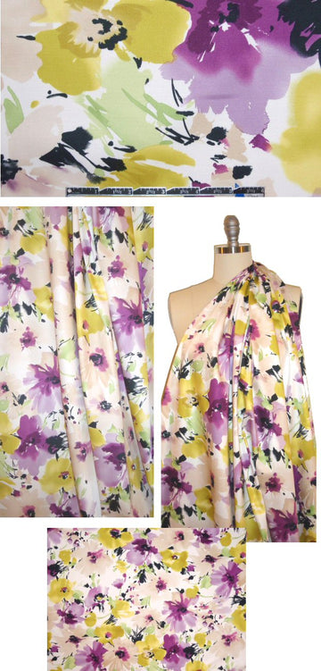 This is a wonderful cotton stretch sateen woven print, an extremely versatile dressweight with about 15% widthwise stretch, and very slight sheen. It's a very high quality cotton, opaque with a cottony drape, and featuring a lovely watercolor floral design (25" repeat) in lavender, lilac, lemon, white, black and sage (PANTONE 16-3320, 15-3508, 12-0643, etc.). Best for a sheath dress, light jacket, stretch pants or capris, skirt, etc. Wash separately, cold, hang to dry, medium iron (please test first!).