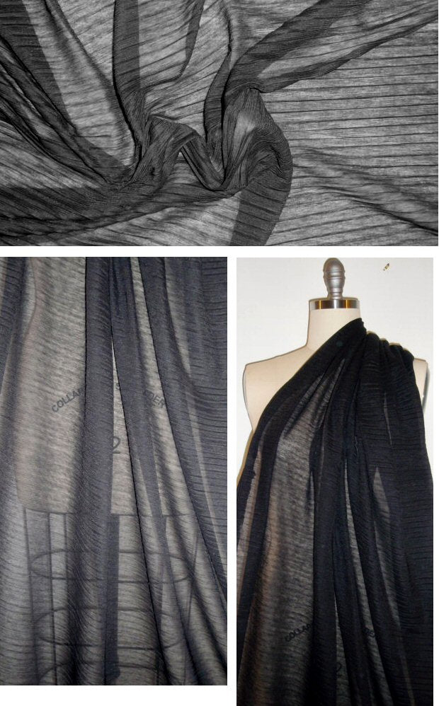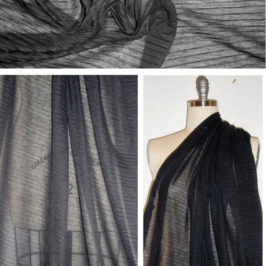 This is the coolest fabric! It comes from a west coast design and is made in Italy, and is a cotton/nylon, finely pleated featherweight knit with 20% widthwise stretch and pleats that expand lengthwise, about 10%. The pleats run from selvedge to selvedge, and your garment can be cut in either direction. It's very lightweight and sheer, and the color is black. Make a goes-with-anything infinity scarf, or line or layer for any number of interesting tops, tees, tunics, overblouse, etc. Hand wash, hang to dry. The fabric is still attached to its tissue pleating paper which will help with accurate measurement, but we will remove the paper before folding and shipping.
