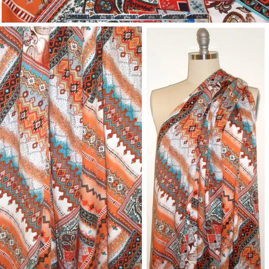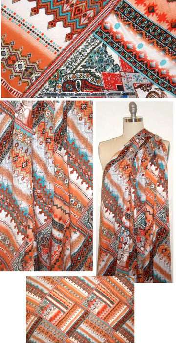 This is a beautiful quality drapey viscose-rayon woven, lightweight but semi-opaque, with a flowing, soft drape. The print is a bold and fabulous southwest graphic design with a 24" vertical and 19" horizontal repeat. The colors are black, white, tangerine, tuquoise, orange clay and sand (PANTONE 16-1349, 16-4530, 16-1344, etc.). Make a pretty tunic, dress, skirt, maxi-dress, etc. Some styles may need lining. The manufacturer recommends machine or hand wash, hang to dry, medium iron.