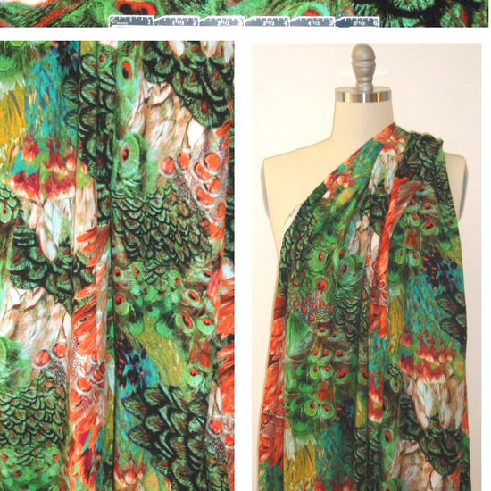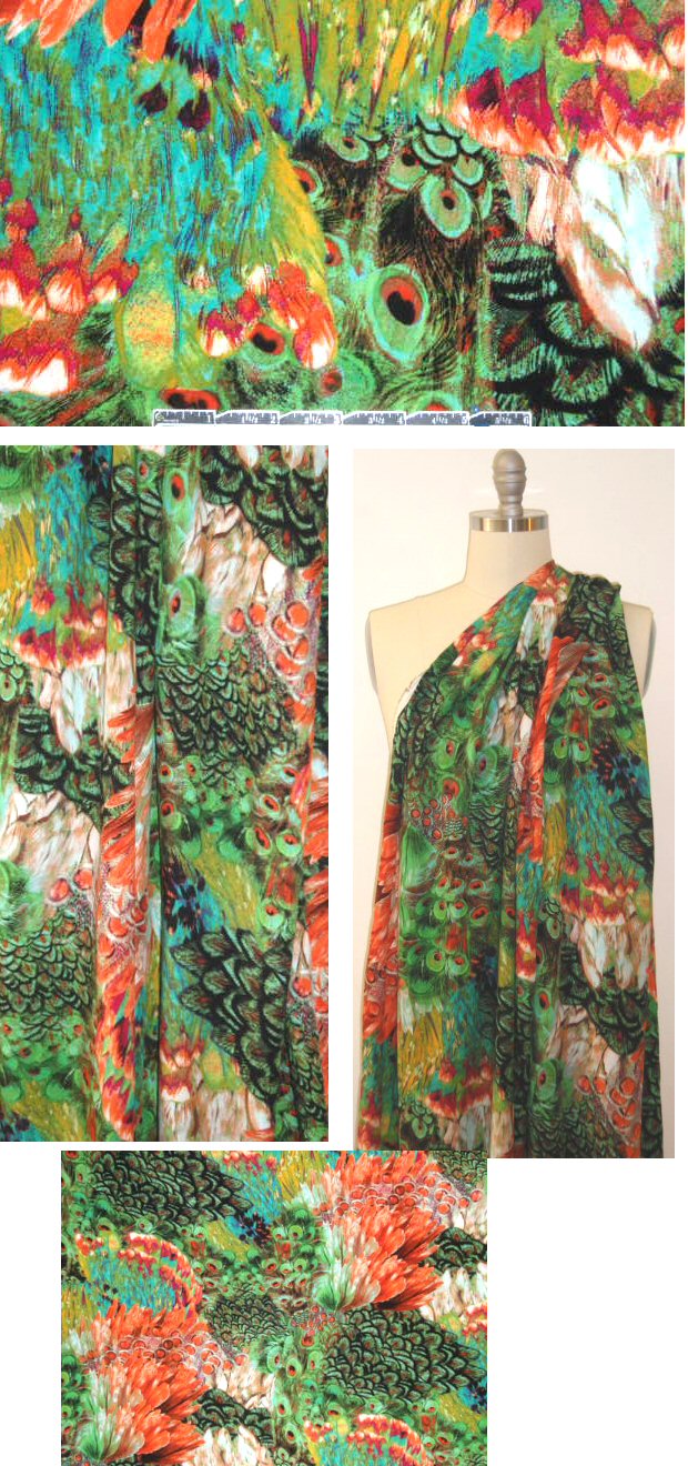 This is a beautiful quality drapey viscose-rayon woven, lightweight but semi-opaque, with a flowing, soft drape. The print is a bold and fabulous peacock fantasy design with a 25.5" vertical repeat. The glorious colors are orange, lime, turquoise, fuschia, black and white, etc. (PANTONE 16-1462, 18-2328, 15-6437, etc.). Make a pretty tunic, dress, skirt, maxi-dress, etc. Some styles may need lining. The manufacturer recommends machine or hand wash, hang to dry, medium iron.