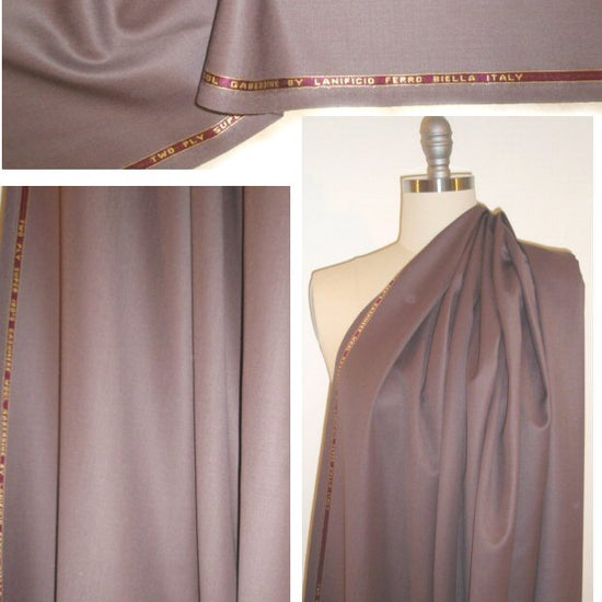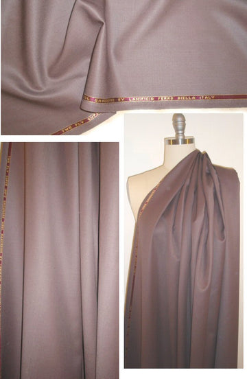 A fabulous quality Italian 2-ply super 180 cashmere/wool gabardine in a mauve brown (PANTONE 18-1404, perhaps half a shade lighter), medium weight with a fine twill weave and lovely drape with some body, perfect for slacks, skirt, jacket, suit. A wonderful classic at a great price! Dry cleaning recommended.