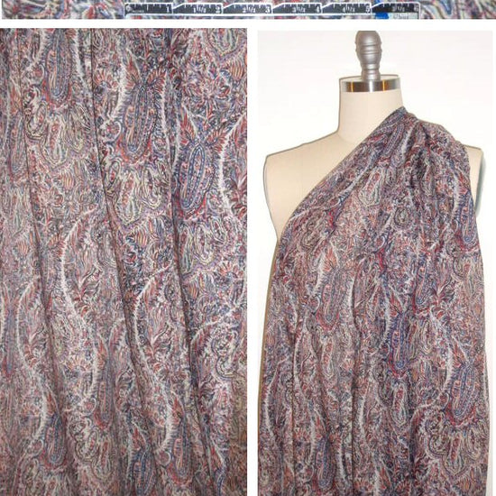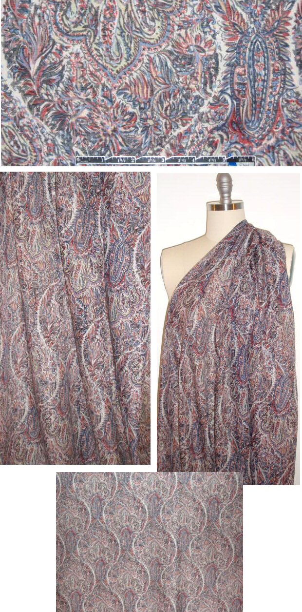 This is a lovely silk/cotton voile from a west coast designer, sheer and floaty with a pretty paisley medallion design (11.5" vertical and 10" horizontal repeat) in tones of red, periwinkle, midnight and off white (PANTONE 18-1658, 16-3929, etc.). Make a scarf, blouse, top or tunic. Lining or layering will be needed. Dry cleaning recommended; if you wish to hand wash, please test first.