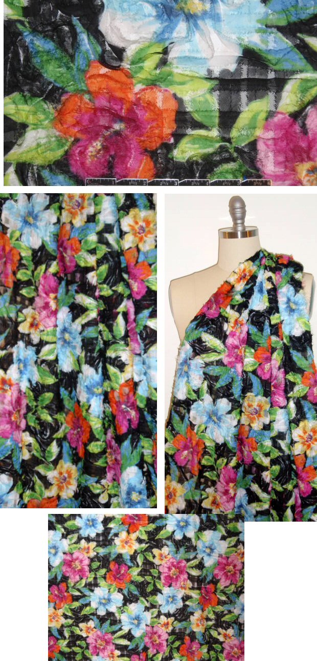 From the sample room of NY designer, this is a fabulous special occasion fabric with a lot of movement and dimension. The underlayer is a sheer nylon mesh which is covered with frayed-edged poly chiffon ribbon strips in a random arrangement. The fabric is then over-printed with a beautiful stylized floral design in vivid colors on a black background (PANTONE 16-1357, 15-4225, 17-6229, 12-0738, etc.). Semi-sheer with lovely drape, and perfect for a party dress, skirt, a fun jacket over a simple sheath dress, etc. Dry clean, or test first if you'd like to try hand-washing at home.
