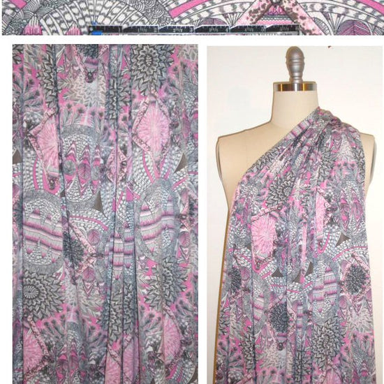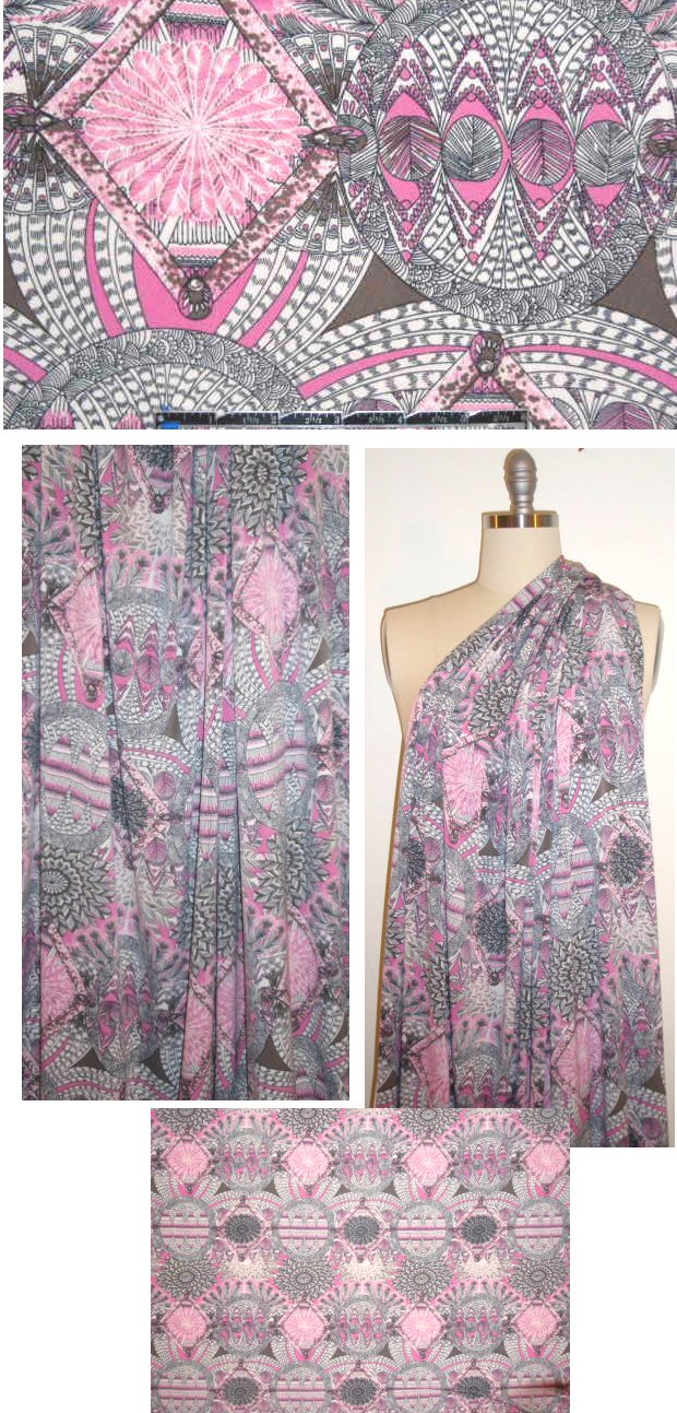 This is a fabulous poly/lycra knit with 2-way stretch (25% in the width only), and it is lightweight and opaque with liquid drape and a wonderful hand that is very much like a high quality rayon/lycra knit. The 'intricate medallion' design (10.75" repeat) is perfect for easy care tops, tees, tunics, maxi dress, etc. Colors include pink, mocha, black and white (PANTONE 17-2624, 19-0810, etc.). Machine wash, hang to dry or tumble dry low.