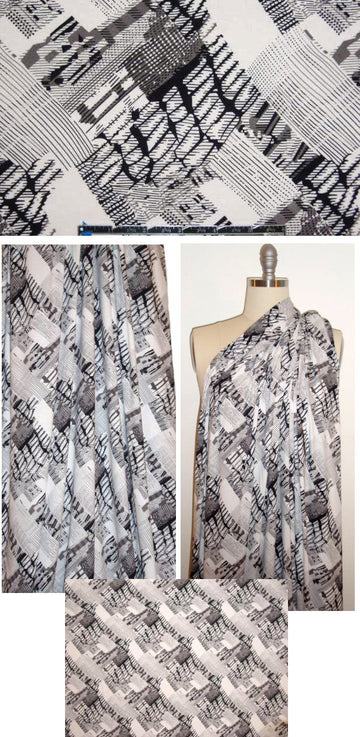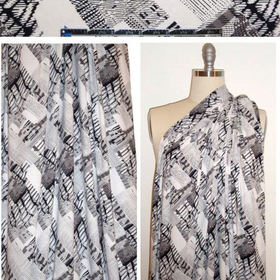 This is a lovely quality 4-way stretch rayon/lycra knit (35% stretch in the width and 25% in the length), opaque yet lightweight with wonderful drape and a "dry" (not slippery) hand. The print is a smart and stylish hatchy abstract graphic in black, gray and white (PANTONE 17-3802), and it's is perfect for any number of tops, tees, tunic, dress, skirt, etc. The manufacturer recommends hand wash or machine wash gentle, hang to dry, no bleach.