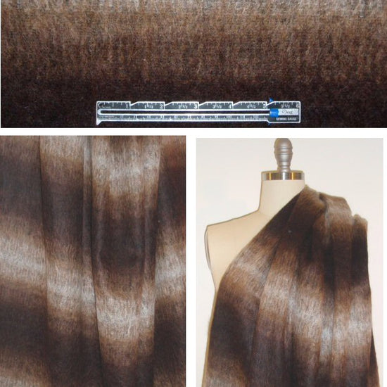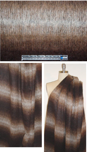 This Italian beauty from a west coast designer is an exquisite wool/mohair ombre stripe woven coating with a 12" repeat. It has an exquisitely soft and cozy brushed mohair texture on the face, and a plainer weave on the reverse. It is drapey with body, and the colors are espresso, monk's robe brown and light smokey tan (PANTONE 19-0508, 18-0933, 12-0605...ish). It's a perfect suiting/coating weight perfect for a fabulous fall jacket or coat, or a cape, throw, wrap, etc. Dry cleaning recommended.