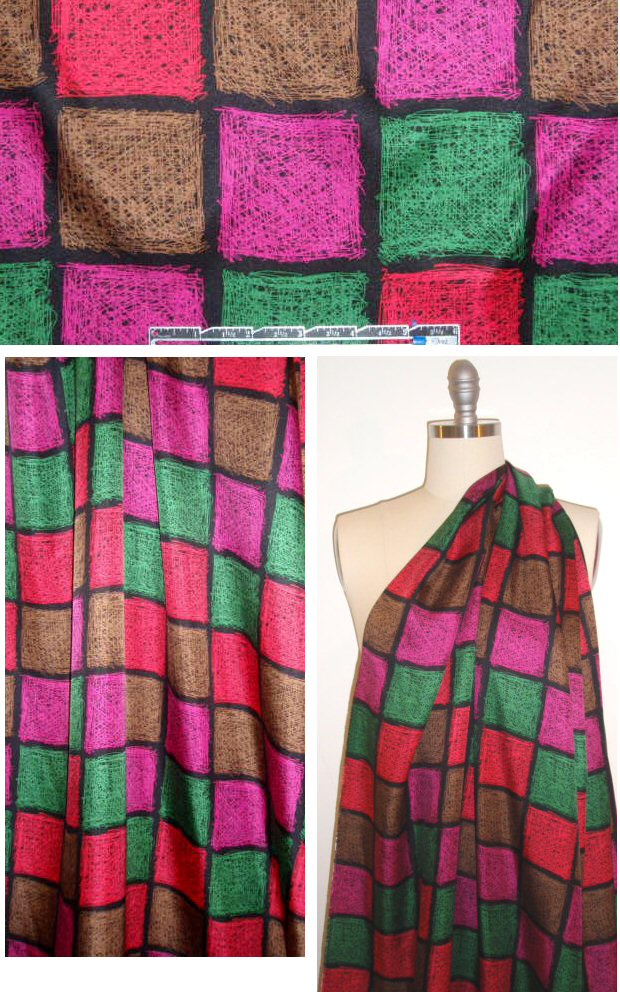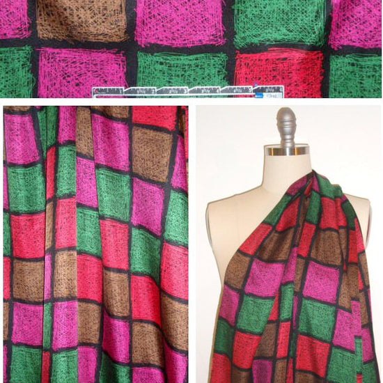 From a small NY designer, this is a lovely and eye-catching silk twill, lightweight yet opaque with a floaty, soft drape that has some body. The fabulous hatchy windowpane design features black, watermelon, cafe-au-lait, hot pink and emerald (PANTONE 18-2120, 16-1432, 18-2333, etc.). Perfect for blouses, tops, tunics, or line for a dress or skirt. It would make a fabulous lining for a coat or jacket as well! Dry cleaning recommended.