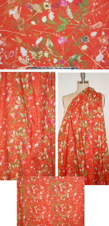 This is a gorgeous stretch cotton dress/shirt weight fabric (about 10% widthwise stretch) from a NY designer sample room, with a somewhat crisp cottony drape. Not sheer, and the print is a stunning floral in shades of mandarin, leafy green, pale yellow, etc. (PANTONE 17-1562, 15-6442, etc.). The green part of the print appears and disappears across the width of the fabric, giving the design an other-worldly look. SO beautiful. Perfect for shirts, skirts, dresses. Please test first if you wish to hand or machine wash at home.