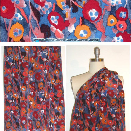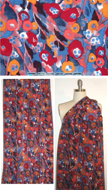 From Rebecca Tay1or, this is a lovely quality silk blouseweight woven, lightweight and semi-opaque with a soft and flowing drape. The wonderful stylized floral design features tones of rich blue, cinnamon, coral red, brick, graphite, etc. (PANTONE 19-4026, 18-1248, 18-1649, 18-1616, etc.), and this beauty is perfect for a blouse, top, tunic, dress, skirt, lining for a lightweight jacket, etc. Dry clean, or test first if you wish to hand wash.