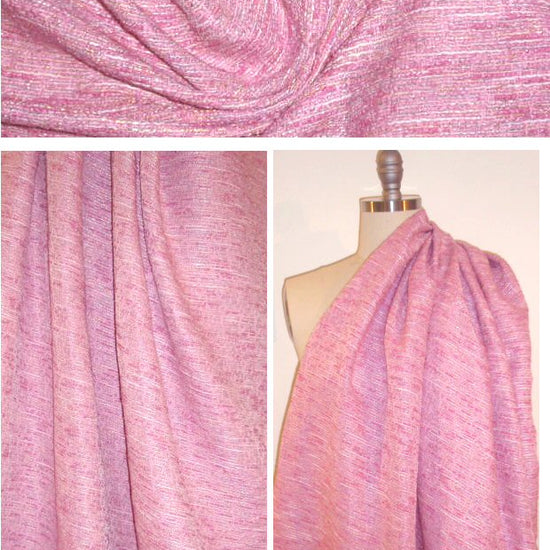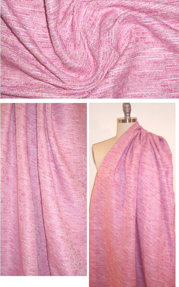 This beautiful tweed from David Meister comes from a German mill, a nubby tweed suiting with a tight weave that has finer white fibers in the warp, and variegated yarns in the weft. The colors are pink, white, and occasional little bits of gold to add a festive look (PANTONE 15-2718, etc.). Medium suiting weight with plenty of body in the drape, it's perfect for a tailored jacket, suit, dress coat, pencil skirt, etc. Dry cleaning is recommended.