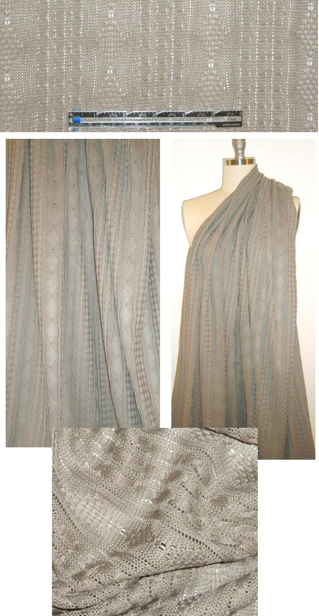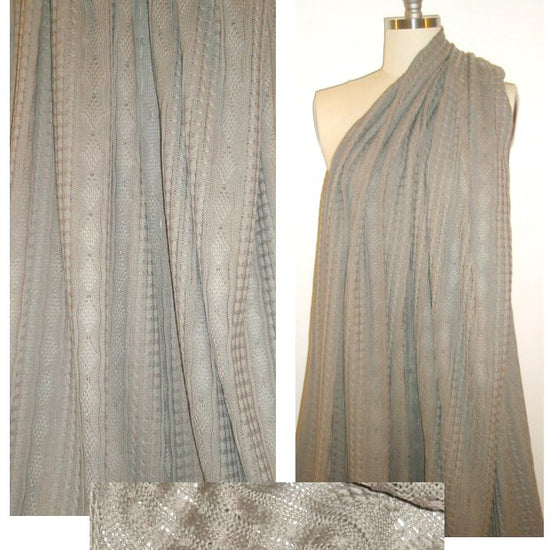 This cable sweater knit is classic, beautiful and easy care! The color is a taupey khaki (PANTONE 16-1305), and it has about 15% widthwise stretch. It is a medium-light weight sweater knit with a soft drape, and lots of dimension and texture, perfect for cardigans, pullovers, tunic, sweater dress or skirt, etc. The knit is slightly open (as seen below) so some styles may need lining or layering. Machine wash in cool water, gentle cycle, lay flat to dry (please test first).